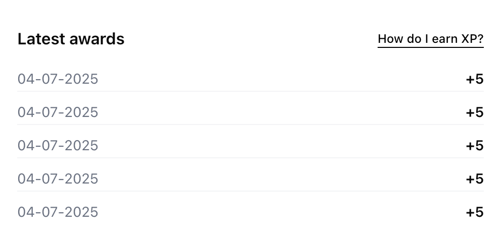 Trophy also has APIs that allow you fetch user’s points data whenever you want. First, the user points API returns the user’s total points for a particular points system and up to 100 of the most recent events that awarded points to or deducted points from them. You can use this API to display the user’s total points anywhere in your platform as well as a ‘Latest awards’ section or similar.