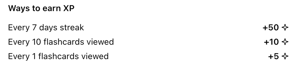 Points systems are used to create counters that track users’ interactions with Metrics, Achievements and Streaks. You can then build features like ‘XP’ and ‘Energy’ around these counters within your product.Use Cases